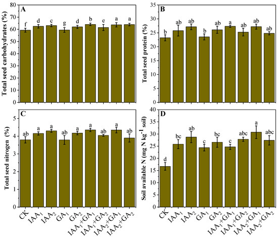 Influence of individual and/or combined foliar application of natural phytohormones on the nutritional status of seeds of mung bean plants, e.g., total carbohydrates (A), protein contents (B), nitrogen contents (C), and soil N availability (D) of the studied sandy-loam soil in sub-tropics. The bar values are an average of three replicates (n = 3), and the bars not sharing the same lowercase letters indicate significant differences from each other according to Bonferroni’s statistical analysis at p < 0.05 level.