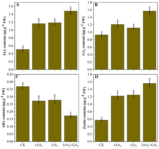 The current study determined the changes in the endogenous IAA GA3, zeatin, and ABA contents after the foliar application of varying concentrations of natural phytohormones on seedlings 60 days after sowing (DAS). The corresponding results are presented in Figure 5A–D. The endogenous production of IAA GA3, zeatin, and ABA was only evaluated under the higher application doses of IAA and GA3 based on the results obtained for growth- and yield-related characteristics. It was noticed that the exogenous applications of GA3 and IAA were correlated with the changes in their endogenous contents of studied phytohormones in mung bean. The combined foliar application of IAA and GA3 (IAA2 + GA2) markedly increased the IAA, GA3, and zeatin concentrations, while it declined the ABA contents in the leaves of mung bean seedlings.