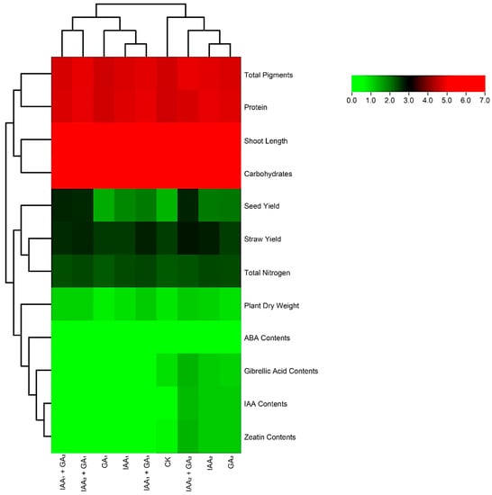 A two-dimensional relationship analysis was carried out to elaborate the distinction between the studied treatments and various physio-biochemical attributes of mung bean plants (Figure 6). The double hierarchical heatmap presented the correlation between the various studied traits of mung bean (row) and different singular and/or combined application levels of natural phytohormones (columns). The column hierarchical dendrogram clearly showed that the effect of IAA2 and GA2 and IAA2 + GA2 on the studied variables of mung bean seedlings under a subtropical environment was much more superior compared to all the other treatments. On the other hand, the analysis also showed that the effect of these treatments was very useful to boost the growth, yield, and biochemical attributes of mung bean seedlings.