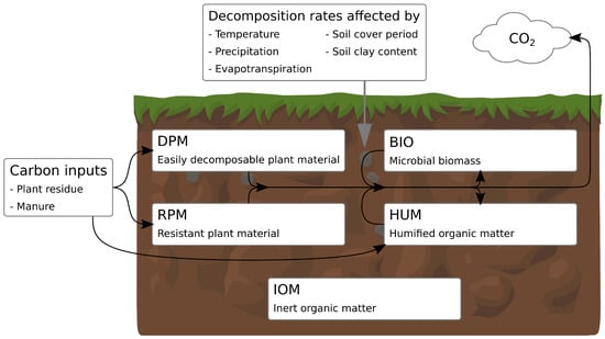 - Coleman, K.; Jenkinson, D.S. RothC-26.3–A Model for the turnover of carbon in soil. In Evaluation of Soil Organic Matter Models; Powlson, D.S., Smith, P., Smith, J.U., Eds.; Springer: Berlin/Heidelberg, Germany, 1996; pp. 237–246. [Google Scholar] [CrossRef]