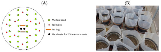 Seeding pattern of Sinapis alba for each experimental pot; toothpicks to assess earthworm activity; tea bags to measure litter decomposition; placeholders for time-domain reflectrometry (TDR) probes to measure soil temperature, moisture, and electrical conductivity (A); and final setup of the pots in the greenhouse with earthworm barriers installed on the top (B).