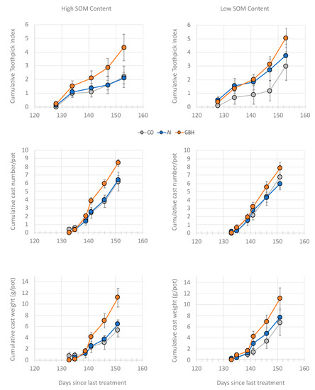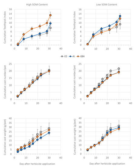 Cumulative toothpick index and cast numbers were significantly affected by GBH treatments; only cast numbers were significantly affected by AIs (Table 6, Figure 3). SOM content only affected toothpick index but not cast number or cast weight (Table 6, Figure 3). GBHs were also interactively affected by SOM; no interaction between AIs and SOM was observed for earthworm surface activity parameters in the short term (Table 6).