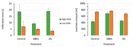 Infiltration time and leachate amount under hand weeding (control) or treatment with glyphosate-based herbicides (GBHs) or respective active ingredients (AIs) under low (3.0%) or high (4.1%) soil organic matter content (SOM). Means ± SE, n = 6.