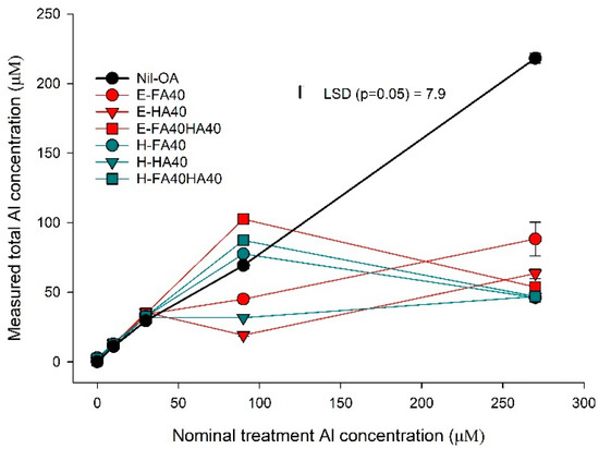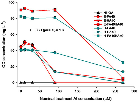 The measured OC concentration in the Nil-OA treatments was consistently 0 mg C L−1 (Figure 2). In the E-FA and E-HA treatments, OC concentration was about 10% higher than that nominally imposed at the treatment Al concentrations of 0–30 µM (Figure 2). The OC concentrations in all H-FA and H-HA treatments at 0–30 µM Al were consistent with the expected OC concentration and not affected by Al addition.