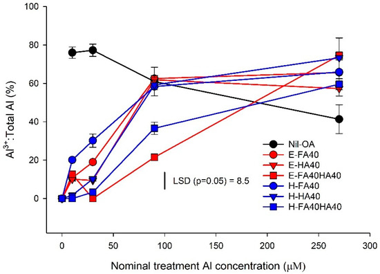 At each treatment Al concentration, the highest Al3+ concentrations were maintained in the Nil-OA treatments (Table 1). In the presence of FA and HA in solution, Al3+ concentration was reduced compared with the Nil-OA treatments (Table 1). However, as the treatment Al concentration in the Nil-OA treatments increased, the proportion of Al present as Al3+ decreased (Figure 3). This was contrary to the general trend observed in the presence of OAs where the proportion of Al3+ increased with increasing treatment Al concentration (Figure 3).