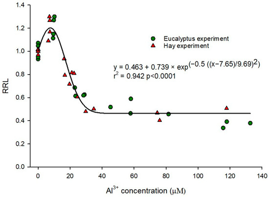 Root growth of maize seedlings in the absence of FA and HA was consistently greater in the presence of 10 µM Al compared with that in the 0 µM Al, indicating growth stimulation by low Al3+ concentrations (about 7–10 µM) (Figure 4). At higher Al concentrations (treatment Al concentrations of 30, 90, and 270 µM) root growth was progressively inhibited. A Gaussian function was fitted for plots of RRL against the Al3+ concentration for both the Eucalyptus and Hay Nil-OA treatments (0–270 µM Al). The Gaussian function accounted for the beneficial effect of Al at 10 µM Al where maximum root growth occurred while accounting for the subsequent reduction in root growth at higher Al concentrations.