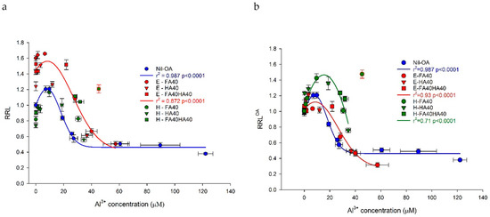 Excluding the potential interaction between Al and the FA and HA components, the direct effect of Al toxicity was confounded with the direct effect of the FA and HA. To better understand this effect, root length was expressed relative to the same OA treatment (e.g., FA40-270 µM Al relative to FA40-0 µM Al) (Figure 6b). When expressed on this basis, the relationship between RRLOA and Al3+ for all Eucalyptus OA treatments essentially matches the relationship observed between RRL and Al3+ in the absence of OA (Figure 6b). However, for the Hay FA and HA, the relationship was somewhat different from the Nil-OA and E-FA and E-HA treatments where RRLOA tended to be higher (1.16–1.36) at Al3+ concentrations of about 15–30 µM and where >~10 mg C L−1 of FA or HA was in solution. Interestingly, for the H-HA40 treatment in the presence of 270 µM added Al, all the HA had precipitated from the solution and the RRLOA (0.56) point at an Al3+ of 34.4 µM corresponded well to the Nil-OA response curve for RRL to Al3+ concentration (Figure 6b) (data point is obscured).