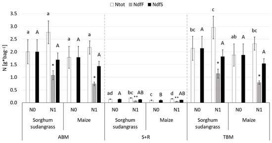 Total N uptake (Ntot), fertilizer N (NdfF) and soil N (NdfS) for plant parts of sorghum sudangrass and maize with the respective fertilization treatment (N0 and N1). Error bars show standard deviation. Lower case letters denote differences of Ntot between sorghum sudangrass and maize as well as fertilization treatments (N0 and N1) within respective plant parts. Upper case letters denote differences of NdfS between sorghum sudangrass and maize as well as fertilization treatments (N0 and N1) within respective plant parts. * and ** denote significant differences (at alpha = 0.5 and 0.1, respectively) of NdfF between sorghum sudangrass and maize within respective plant fractions.