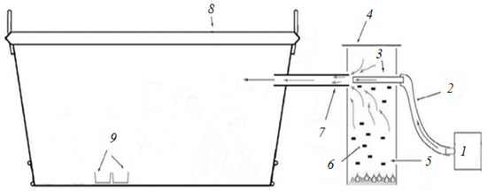 Scheme of the installation for soil fumigation: 1—Hailea ACO 208 air compressor; 2—hose from the air compressor for air supply to the smoke generator; 3—tube for air supply to the chimney; 4—Merkel Standart smoke generator; 5—holes for ignition of combustion materials; 6—smoke from thermal destruction of combustion materials; 7—chimney for smoke supply to the gas chamber; 8—gas chamber; 9—soil samples.