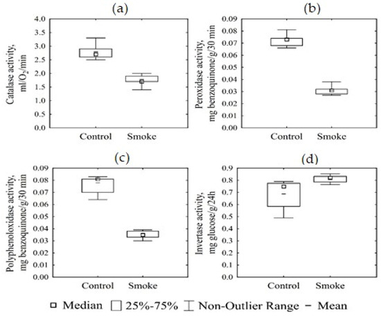 In Figure 3a range diagram of the values of the investigated enzymes are presented, showing a significant difference between the control values and the smoke. Enzymes of the oxidoreductase class (catalase, peroxidase, and polyphenol oxidase) are particularly prominent. Invertase differences are noticeable as well, but the values between control and experimental samples are less pronounced compared with the rest of the enzymes.