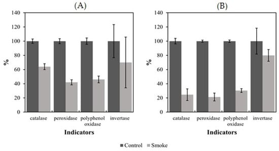 Changes in enzymatic activity of Cambisols (A) and Haplic Chernozem (B) after smoke exposure in model experiments (changes significant at p < 0.05 for catalase, peroxidase, and polyphenol oxidase).