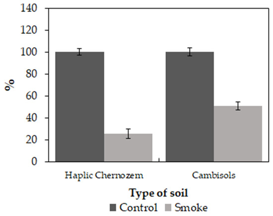As part of this research, a large change in the pH of the water was seen, which has probably been caused by the accumulation of CO2. Carbon dioxide dissolves in water to form carbonic acid. After an hour of smoke exposure, the pH value in the control sample decreased from 5.82 to 3.63. We can assume that the soil suspension pH decreases to a lesser rate than the water pH in the analysis as a result of the high buffering of the soil. Thus, the soil is a filter which can absorb toxic gases and prevent negative impacts from smoke on the soil organisms. Similar studies were conducted by us earlier on another soil type (Haplic Chernozem) [14].