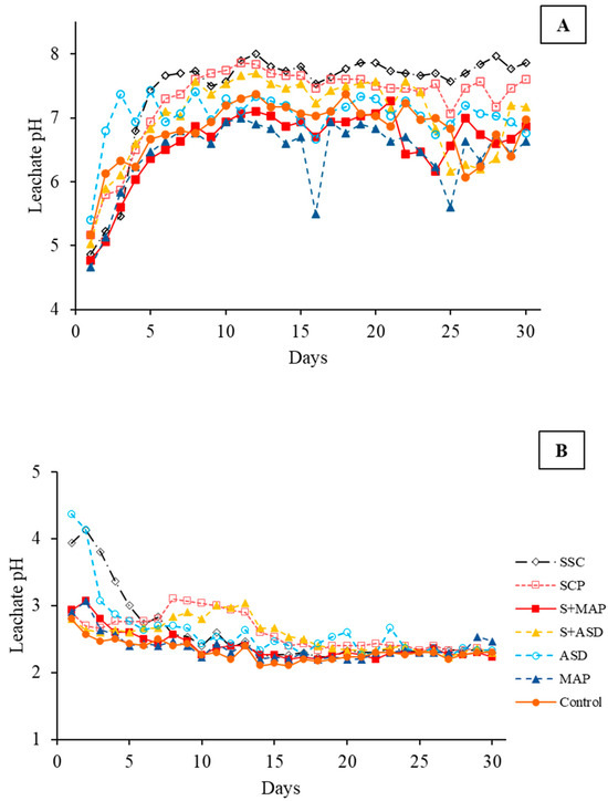 For the other treatments the average pH stabilized after 7–8 days to just above the neutral value (SSC = 7.4; SCP = 7.3; S + ASD and ASD = 7.0). The SSC was the treatment with the greatest pH range (4.9–8.0), but a neutral/slightly alkaline pH prevailed for most of the observed time. Reports of pH increases in acidic soils due to the application of SSC are common in the literature, staying in the range from neutral to slightly alkaline, due to the ammonification process that consumes H+ and generates OH−; however, subsequent ammonia nitrification is common, reducing it to nitrate and releasing H+, thus acidifying the soil soon after [45]. As can be observed, the pH values of the leachate did not decrease even at the end of the trial, which may be related to the low mineralization of the organic compost in the analyzed period. On the other hand, the constant leaching may have caused the removal of basic cations present in the compost, which would result in a higher pH value of the leachate.