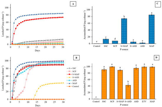 Accumulated daily P leached with water (A) and citric acid (B). Total P leached in water (C) and citric acid (D) in 30 days. Equal letters do not differ statistically according to the Scott–Knott test at a 5% significance level. Error bars represent standard error of the means (n = 3). SSC = organic sewage sludge compost; SCP = pelletized sludge compost; S + MAP = compost + MAP; S + ASD = compost + AshDec®; ASD = AshDec®; MAP = monoammonium phosphate.