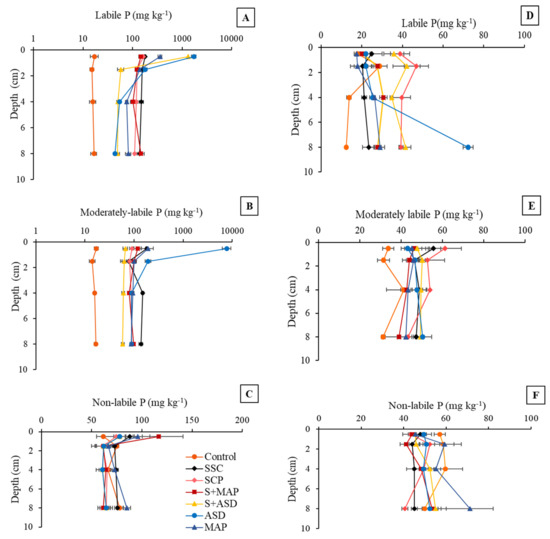 Soil P pools obtained by the soil fractionation method from columns leached with water (A–C) and citric acid (D–F), grouped by lability. Error bars represent standard error of the means (n = 3). SSC = organic sewage sludge compost; SCP = pelletized sludge compost; S + MAP = compost + MAP; S + ASD = compost + AshDec®; ASD = AshDec®; MAP = monoammonium phosphate.