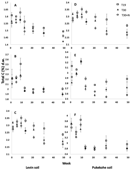 Changes of total C (CT) in soils with time in treatments T-19, T-30, and T-30+N ((A) Levin soil control, (B) Levin soil+ MC, (C) Levin soil+SC, (D) Pukekohe soil control, (E) Pukekohe soil+MC, (F) Pukekohe soil+SC). Error bars represent the standard error of the mean (n = 3).