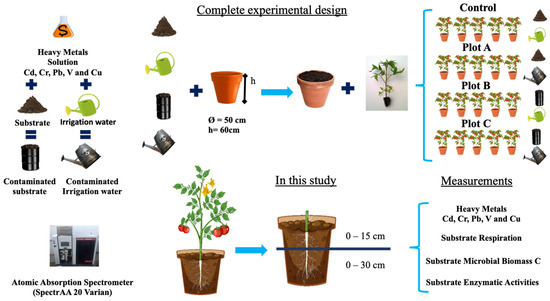 The experimental design was carried out outdoors as shown in Figure 1. Twenty pots of ø50 cm and h60 cm were used and divided into 4 groups of 5 pots each. The first 5 pots were the control plot, where uncontaminated irrigation water and commercial growing substrate were used (Control). In the other 3 groups, i.e., the remaining 15 pots, different combinations of substrate, contaminated substrate, irrigation water, and contaminated irrigation water were used. Tomato seedlings were then planted and grown (4 per pot and 15 cm apart) to reproduce extreme contamination conditions in a controlled manner. Each pot was watered regularly every other day. The control plot and plot B were regularly irrigated with uncontaminated water, while plots A and C were irrigated with contaminated water. After about three months, from June to September (when the tomato plants were uprooted), the substrate was analyzed again. The substrate was collected at two depths, 0–15 and 15–30 cm, corresponding to the rhizosphere and the area immediately below it, respectively. Each sample was sieved (<2 mm) and divided into subsamples for determination of substrate chemical characteristics and substrate biological activities. Sub-samples used for enzyme activity measurements were stored at −80 °C until analysis.