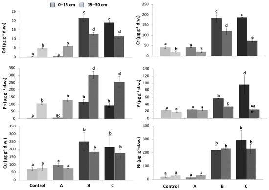 Figure 2 shows the assayed contents of V, Ni, Pb, Cd, Cu, and Cr in the treated substrates (plots A, B, C) and compares them to those of the control plot at two different depths (0–15 and 15–30 cm).