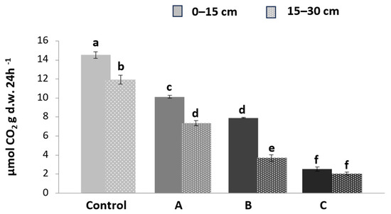 Figure 3 shows the CO2 evolution produced by the oxidation process of organic matter by the substrate microbial population in three different treatments (A, B, C) at two different depths (0–15 and 15–30 cm) compared to the control plot.