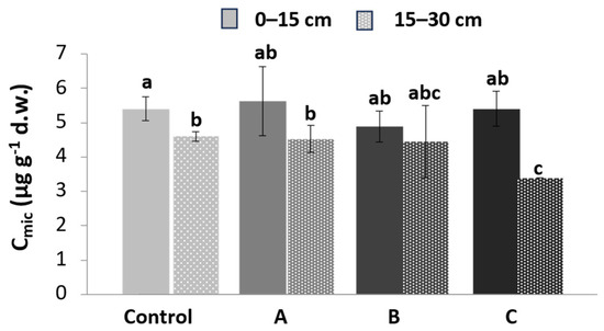 Figure 4. Microbial biomass content, Cmic, in substrate samples in the three plots (A, B, C) compared to the control plot at two depths: 0–15 (continuous color) and 15–30 cm (color with pattern fill). The intensity of the color is proportional to the degree of contamination. Different letters above bars indicate significant differences between mean values at each sampling (p < 0.05).