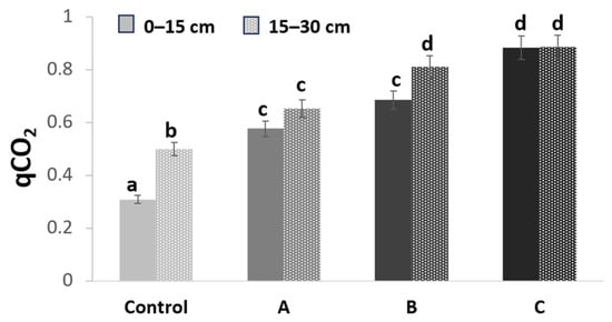 Substrate CO2 evolution also appears to be reduced in the presence of HMs. This was confirmed by the increase in the metabolic quotient, qCO2, in both treatments B and C (Figure 5). Indeed, the toxicity of HMs makes microbial metabolism less energy efficient, requiring more carbon to sustain it and reducing the amount of carbon available for microbial biomass [49,50].