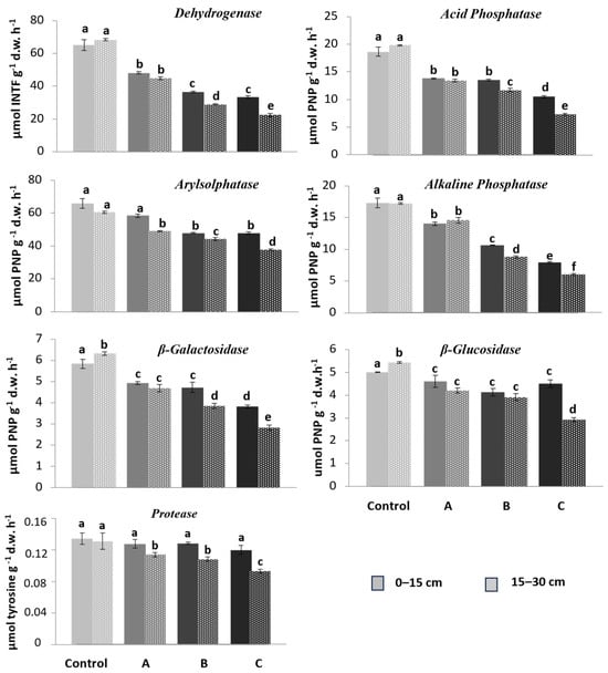 Figure 6. Substrate enzyme activity in substrate samples in the three plots (A, B, C) compared to the control plot at two depths: 0–15 (continuous color) and 15–30 cm (color with pattern fill). The intensity of the color is proportional to the degree of contamination. Different letters above the bars indicate significant differences between mean values at each sampling (p < 0.05).