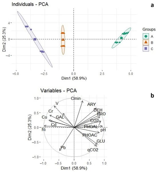 A principal component analysis (PCA) was used to validate the results of this investigation (Figure 7). The first two components (Dim1 and Dim2) cumulatively represent 68.2% and 17.6% of the variability. The PCA findings indicate a clear differentiation between the four treatments (Control, A, B, C) (Figure 7a). Treatments B and C were more strongly affected by the heavy metal variables, whereas Control and A were more influenced by the biological properties tested (Figure 7b).