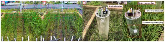 Experiment plots under (a) alternate wetting and drying (AWD) irrigation regime, (b) continuous flooding (CF) irrigation regime, (c) static chamber, and (d) equipment.