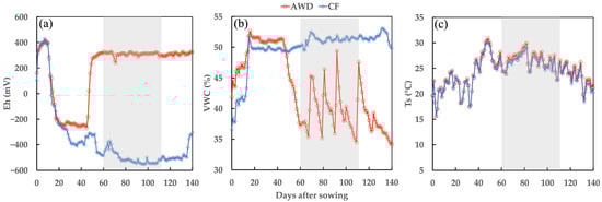 Seasonal variation of (a) soil redox potential (Eh), (b) volumetric water content (VWC), and (c) soil temperature (Ts) under alternate wetting and drying (AWD) and continuous flooding (CF) irrigation regimes. The shaded area indicates the gas measurement period.