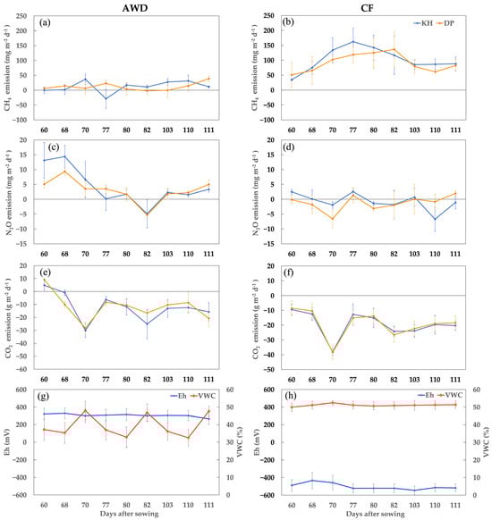 Methane (a,b), nitrous oxide (c,d), and carbon dioxide (e,f) emissions from lowland (Koshihikari, KH) and upland (Dourado Precoce, DP) varieties together with soil redox potential (Eh) and volumetric water content (VWC) under alternate wetting and drying (AWD) (a,c,e,g) and continuous flooding (CF) (b,d,f,h) irrigation regimes. Vertical bars indicate the standard error of the mean (n = 3).