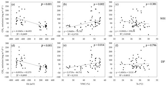 CH4 emissions were significantly more profound between irrigation regimes than rice varieties (Figure 3a,b). During the measurement period, the emission rates ranged from −84.99 to 67.49 mg m−2 d−1 under AWD irrigation and 29.00 to 243.40 mg m−2 d−1 under CF irrigation in the lowland variety (KH). These ranged from −46.31 to 57.46 mg m−2 d−1 under AWD irrigation and 3.89 to 255.95 mg m−2 d−1 under CF irrigation in the upland variety (DP). Correspondingly, the emission peaks under CF irrigation were discovered 77 and 82 DAS in KH and DP, respectively. The CH4 emission rates under CF irrigation were significantly higher than those under AWD irrigation from 68 to 111 DAS (Table 1, < 0.05). However, CH4 emission was not significantly affected by rice variety (Table 1). Significant correlations between CH4 emission and Eh and VWC were discovered in both varieties (Figure 4a,b,d,e), while Ts was not significantly correlated with CH4 emissions in either variety (Figure 4c,f). Negative and positive correlations were also observed between CH4 emission and Eh and VWC, respectively (Figure 4), indicating that an increase in soil Eh or a decrease in VWC can reduce CH4 emission.