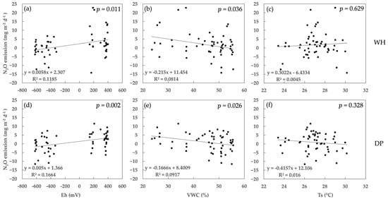 Relationship between nitrous oxide (N2O) emission and soil redox potential (Eh) (a,d), volumetric water content (VWC) (b,e), and soil temperature (Ts) (c,f) from lowland (Koshihikari, KH) (a–c) and upland (Dourado Precoce, DP) (d–f) varieties.