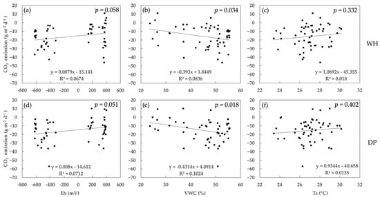Relationship between carbon dioxide (CO2) emission and soil redox potential (Eh) (a,d), volumetric water content (VWC) (b,e), and soil temperature (Ts) (c,f) from lowland (Koshihikari, KH) (a–c) and upland (Dourado Precoce, DP) (d–f) varieties.
