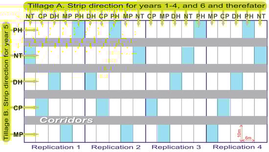 Experimental design. (MP = conventional moldboard plow tillage, CP, chisel plow tillage, PH = power harrow tillage, DH = disk harrow tillage, NT = no-tillage). Blue shaded polygons indicate plots with an all-year constant tillage regime.