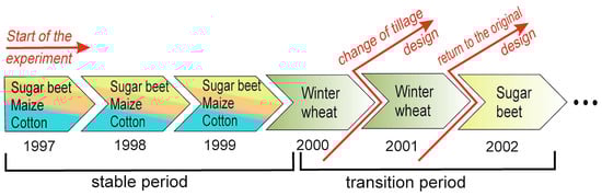 A regional common crop rotation scheme was followed, including annual summer and winter crops (Figure 2). Multiple rotations of sugar beet, maize, and cotton were followed during the 1997–1999 summer periods, winter wheat was introduced in 1999–2000 and 2000–2001, and the summer cycle started again with sugar beet in 2002, continued with maize in the following year, and other crops thereafter (the experiment is still running). Both fields were fallow for a long period before starting the trials.