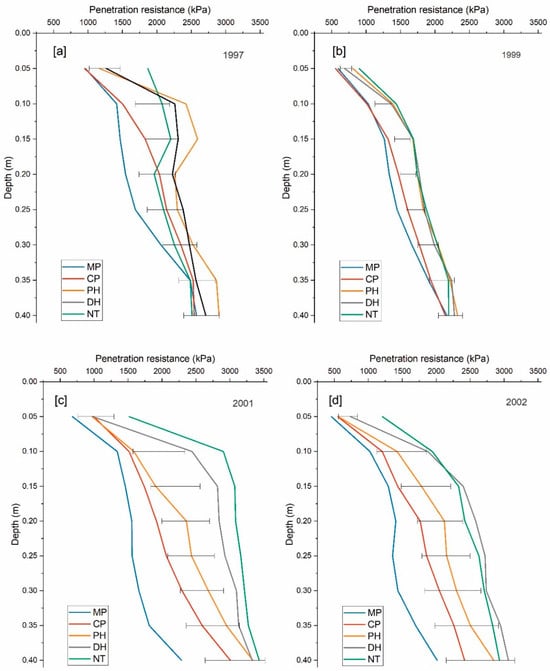 Soil penetration resistance at the permanent tillage treatments (error bars indicate 95% confidence intervals range, numerical results from the statistical analysis are presented in Supplementary Materials Tables S1–S4). (a–d) indicate results from different years.