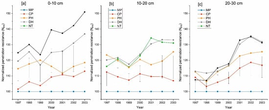 Timeseries of soil compaction accessed through normalized penetration resistance measurements over a period of six years for the permanent tillage schemes (error bars indicate 95% confidence intervals range). (a–c) indicate normalized penetration resistance for different depths.