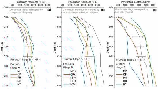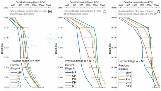 Tillage rotation effects in soil penetration resistance in 2001 (error bars indicate 95% confidence intervals range, numerical results from the statistical analysis are presented in Supplementary Materials Table S3).