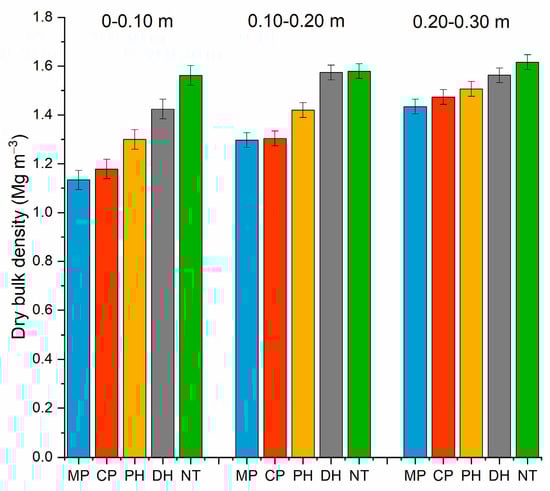 Dry bulk density of the soil for the five permanent methods of tillage in 2000 error bars indicate 95% confidence intervals range, numerical results from the statistical analysis are presented in Supplementary Materials Table S6).