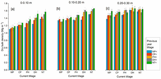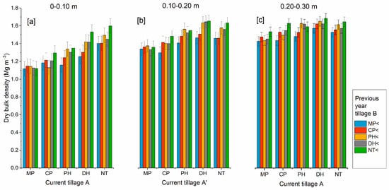 In the following year, rotations to the tillage treatments were introduced (Figure 9). The plots receiving the same tillage treatment for a fifth year continue to present the same behavior. MP had a DBD of 1.11 Mg∙m−3 at the 0–0.10 m sampling depth, which increased to 1.33 Mg∙m−3 at the 0.10–0.20 m depth and reached 1.42 Mg∙m−3 at a depth of 0.20–0.30 m. NT, on the other hand, presented an increased DBD of 1.60 Mg∙m−3, even from the topsoil layer that reached a peak of 1.64 Mg∙m−3 at the 0.20–0.30 m depth. Intermediate values were found for the rest of the tillage treatments. It is remarkable that the previous year’s tillage presented a considerable residual effect on soil compaction. Whenever a deep kind of tillage was performed during the previous year (including moldboard plowing or the use of a chisel plow), the soil compaction was lower. The effect was more profound at the less intensive methods of DH and NT. For instance, the DBD at the DH method for the 0–0.10 m layer was 1.41 Mg∙m−3 when the method was applied constantly, but dropped to 1.12 Mg∙m−3 if moldboard plowing had been performed during the previous year. At a greater depth of 0.10–0.20 m, DBD was 1.64 Mg∙m−3 and 1.33 Mg∙m−3, respectively. The same applied when no-tillage was performed after moldboard plowing. These differences were statistically significant (p-values < 0.001, Supplementary Materials Table S7).