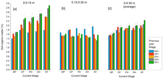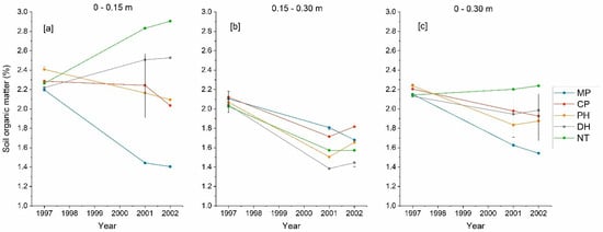 Change in soil organic matter during a five-year period with permanent tillage treatments (error bars indicate 95% confidence intervals range). (a–c) indicate results from different depths.