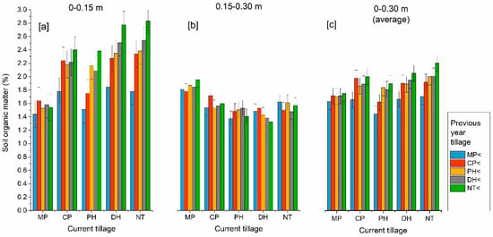 Soil organic matter in permanent and rotational schemes of tillage in 2001 (error bars indicate 95% confidence intervals range, numerical results from the statistical analysis are presented in Supplementary Materials Table S9).