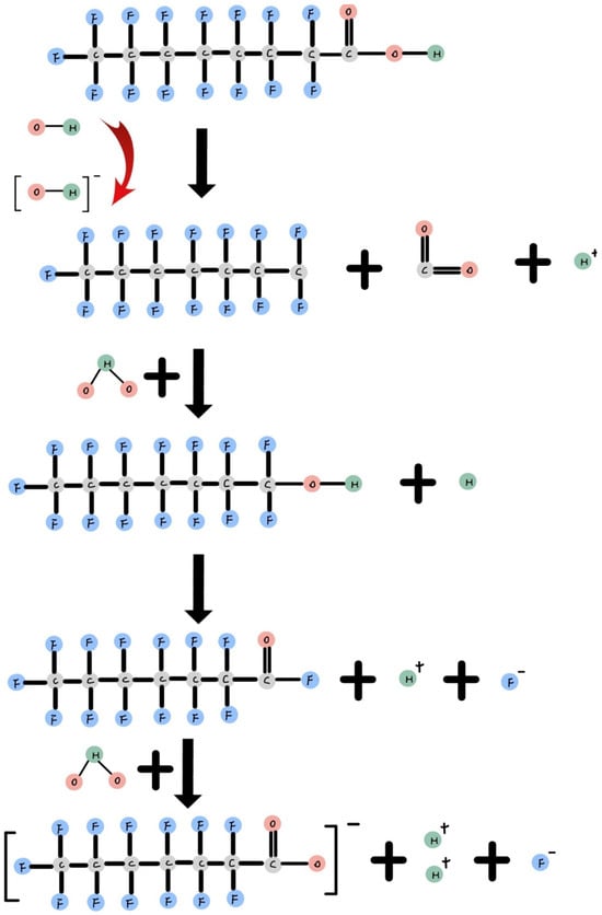 Figure 3 shows during an oxidation reaction, H2O2 and O3 are used in combination with ferric ions or persulfate in an aerobic environment to generate hydroxyl radicals (OH•). When these OH• radicals attach to dissolved PFOA, they remove the carboxylic group as CO2, forming a C7F15 radical [36]. Subsequently, a water molecule attaches to the radical, facilitating hydroxylation and the elimination of one fluorine atom. Afterward, another water molecule is involved in hydrolysis, releasing another fluoride ion [9]. Following the elimination of fluoride ions and the shortening of the alkyl chain, C8 PFOA transforms into C7 PFHpA, representing the initial stage of intermediate product degradation. This process continues, gradually breaking down C7 PFHpA into C6 PFHxA, and further into C5 PFPeA as the alkyl chain becomes shorter. This degradation process ultimately results in the formation of fluoride ions and CO2 [65]. Despite PFOA’s inherent stability, Gomez-Ruiz’s photocatalytic degradation experiment reduced the total organic carbon (TOC) by 62%, indicating mineralization during PFOA degradation [65].