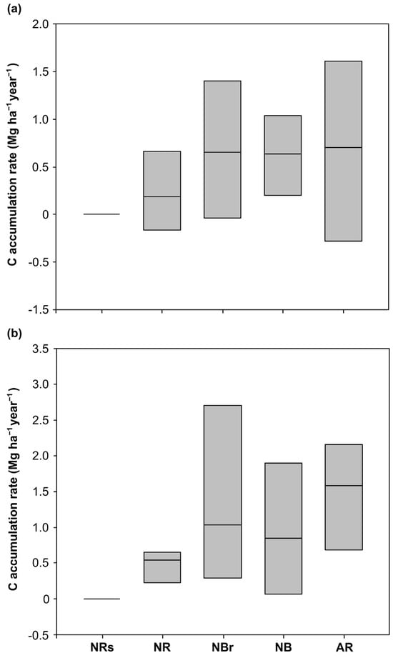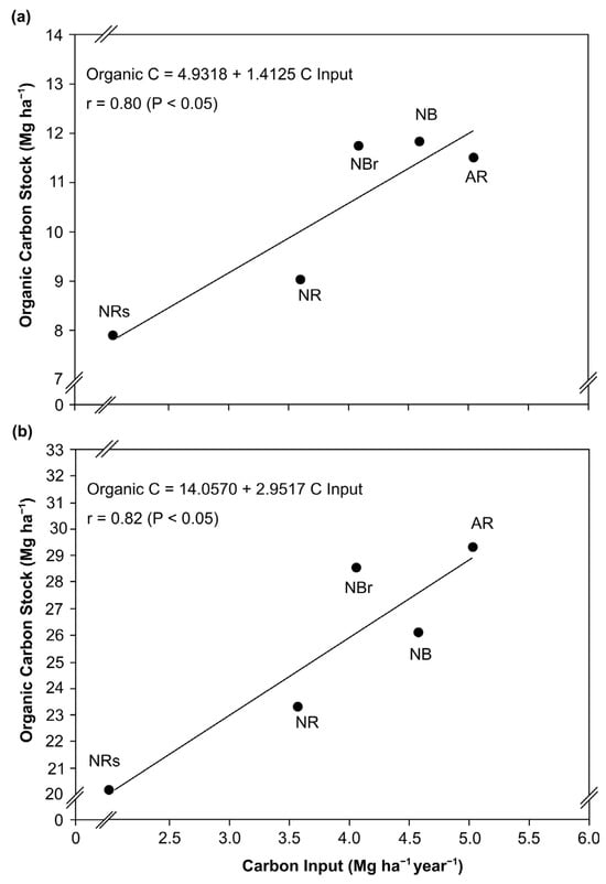 Annual soil C retention rates were calculated by subtracting the C stock in the treatment from C stock in the NRs treatment (Equation (6)), considering a period of six years.