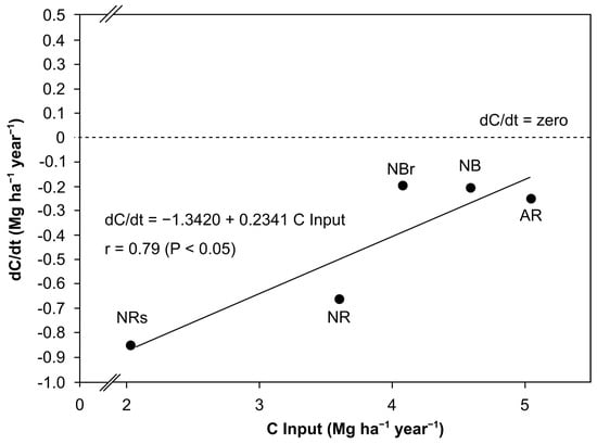 Relationship between the amounts of C added and the variation (dC/dt) of the soil organic C stocks in the 0–20 cm layer cultivated under different managements of eucalyptus harvesting residues at six years of age.