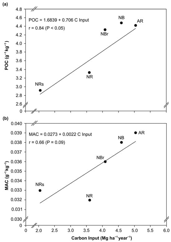 Relationship between the amounts of carbon added and the particulate organic C (POC) (a) and the mineral-associated organic C (MAC) (b) of the SOC stocks in the layer of 0–20 cm of a soil cultivated under different managements of eucalyptus harvesting residues at six years of age.