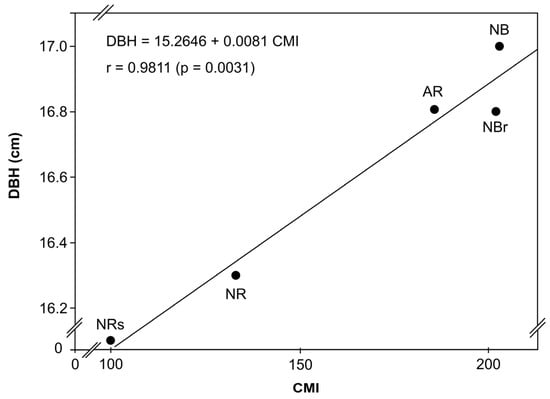 Relationship between the C management index of the soil (CMI) and the diameter at breast height (DBH) under different managements of eucalyptus harvesting residues at six years of age.