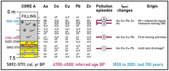 These four episodes are also detected when Igeo is applied to the concentrations of the five elements (Figure 2). The first episode (~5.8 cal. kyr BP) is characterized by the transition from UP (As, Co, Cu) or VLP (Pb) sediments to VLP (Co) or LP (As, Cu, Pb) sediments. These four elements also show similar variations in their pollution class during the second episode (~4.7–4.5 kyr BP), most marked for Pb (from UP to LP) and to a lesser extent for As (from VLP to LP).