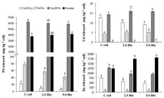 3.2. Influence of Biochar on the Mobility of Pb, Cd and Zn in Soil