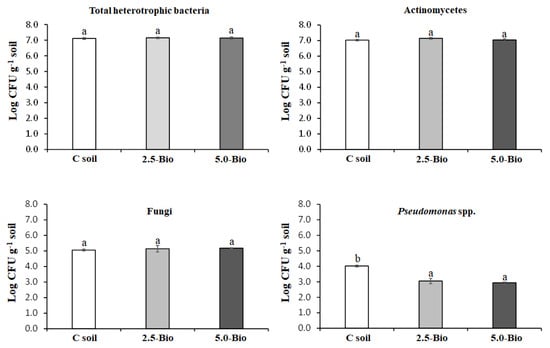 3.3. Influence of Biochar on Culturable Microorganisms and Soil Microbial Biomass